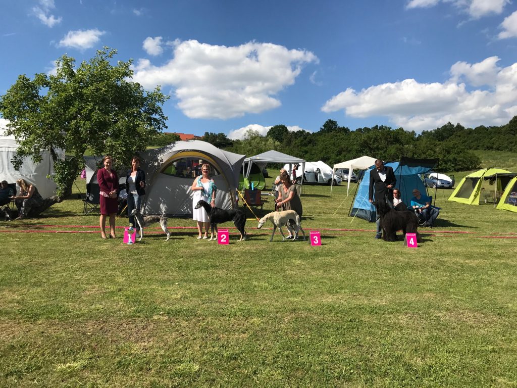 Unseren Urlaub haben wir genutzt und sind auf der Landessiegerausstellung Nordbayern „gelandet“. Das Ausstellungsgelände war ganz idyllisch, die Ausstellung toll organisiert und gut besucht. Gut 30 Whippets traten bei der Rassespezialistin Thompson/GB an.