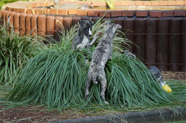 Die Zwerge versuchten gestern der Hitze zu trotzen, in dem sie sich unter den Buchsbäumen in die Erde gegraben haben. Aber ab und zu kam der Spieltrieb dann doch zum Vorschein 🙂 Mal sehen, wie wir den Tag heute überleben.
