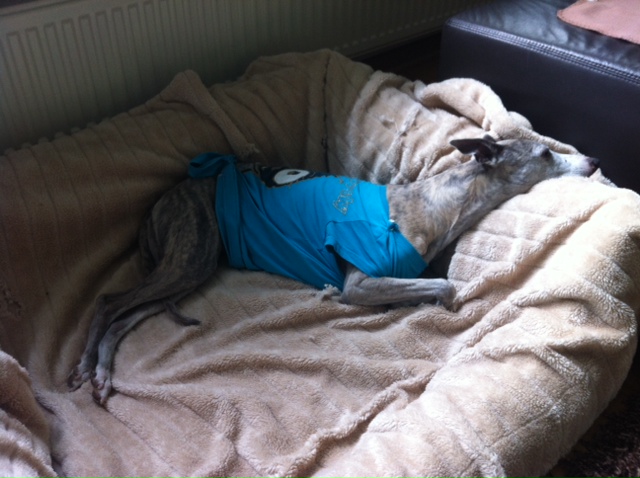 Grace trägt im Moment ein modisch blaues T-Shirt, mit dem Aufdruck „sweet little Bee“ 😉 , das sie vom Lecken am Verband abhalten soll. Süß sieht sie aus damit und es geht ihr gut! Sie hat sich von der OP prima erholt, humpelt nicht und ist sogar schon eine kleine Runde mit marschiert heute morgen.