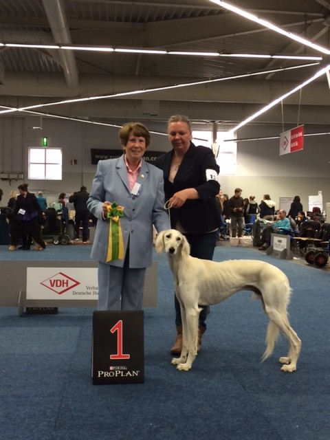 Diese tolle Nachricht möchte ich nicht vorenthalten. Anke war mit Louis, Macello Sawahin, auch in Dortmund. Frau Peschges/D bewertete am CACIB-Tag die Salukis.