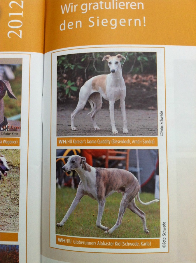 Vor einigen Wochen bereits durfte ich stolz verkünden, dass Eve,                                BISS Karasar’s Jaama Quiddity, den NRW-Cup 2012 gewonnen hat. Vorgestern bekam ich die Mai-Ausgabe des Verbandsorgans „unsere Windhunde“, in der die NRW-Cup-Gewinner mit einem Foto abgebildet sind.