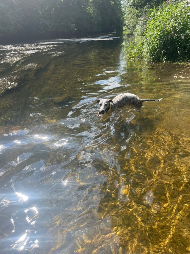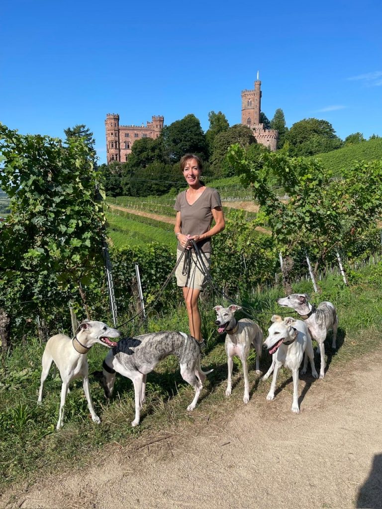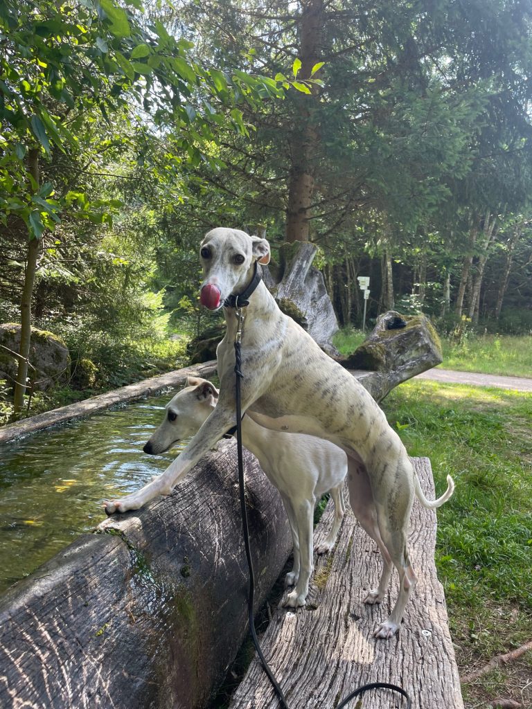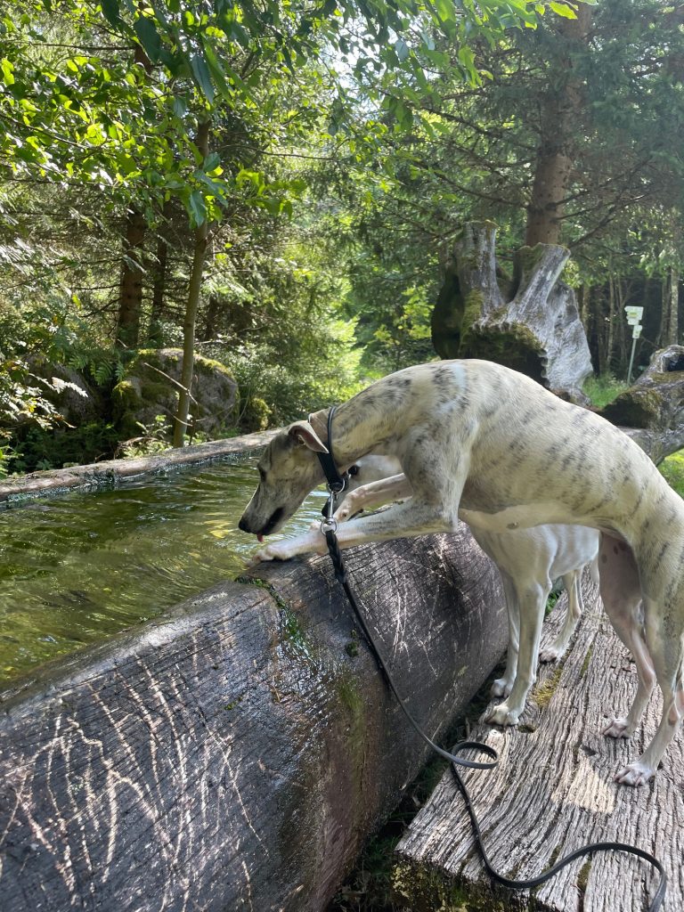 Joy geht gern ins Wasser. Juli bislang freiwillig noch nie. Aber es war so heiß, dass sogar sie sich überwunden hat. Baden in der Donau. Eine schöne Abkühlung.Abkühlung gab es auch hier im Schwarzwald an einer eisig kalten Quelle während einer WanderungWarten auf Arnd, der gerade einkaufen war. Das war ein kleiner Kräutergarten im Anschluss einer alten Mühle. All meine Schätze auf einem Haufen. Penny, Eve, Arnd, Joy, Juli und QueenieKlar. Alles ist interessanter alt ich, die mal wieder ein Foto machen will.Durch die Weinberge zum Schloss. Ich habe nach dem Aufstieg tatsächlich noch die 103 Stufen des Schlossturms erklommen. Das hat sich gelohnt. Der Blick in die Ferne war fantastisch!Lange gesucht und endlich gefunden: mein eigenes Wohnmobil. Na dann kann der nächste Urlaub ja kommen!