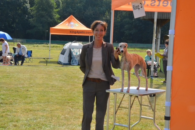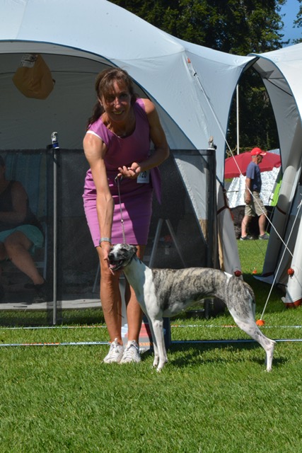 Am vorletzten Samstag stellte Sandra Cuno in Gelsenkirchen aus, wo Herr Henne/D die Whippets richtete. Als nachträgliches Geburtstagsgeschenk wünschten wir uns alle das letzte CAC zur Vollendung des Championats für Cuno. Herr Henne mochte Cuno schon in der Jugendklasse, wo er ihm den Titel des „Bundesjugendsieger“ zusprach und sein Geschmack hat sich nicht verändert. Cuno erhielt ein V1 in der offenen Klasse und im Stechen sein letztes benötigtes CAC!!