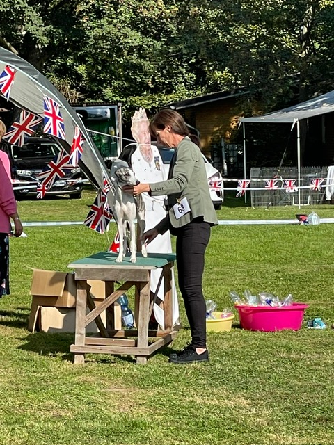 Die Ringe waren großzügig geschnitten und liebevoll von Uli und ihrem Team im englischen Stil geschmückt worden (es gab sogar eine lebensgroße Papp-Queen, die zwischen den Ringen alles im Blick hatte); der Tisch mit den Spenden, Gaben, Sonderpreisen, Wanderpokalen und Siegerschleifen war reichlich gedeckt. Das Ringpersonal in beiden Ringen hat ganz Arbeit geleistet und neben ihrem eigentlichen Job jedem teilnehmenden Hund ein kleines Präsent überreicht. Auch die platzierten Hunde jeder Klasse wurden bedacht.