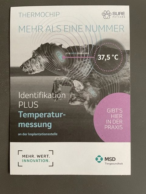 Im übrigen gibt’s etwas Neues, dem wir uns natürlich nicht verschlossen haben: den Thermo-Chip. Dieser ermöglicht nicht nur das Ablesen der Chip-Nummer sondern auch der Körpertemperatur! Eine tolle Innovation. Rektales Temperaturmessen entfällt also in Zukunft!