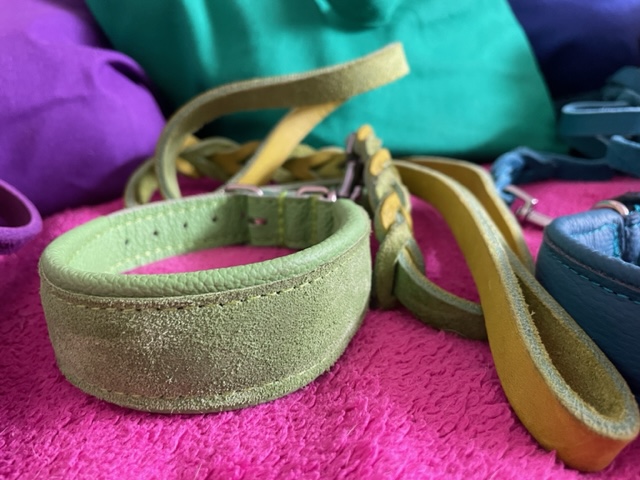 ein letztes Foto bei uns, bevor es ins Auto und ab nach Hause gehtUnerreicht: Sandra hat für alle Welpen nicht nur Halsbänder anfertigen lassen, sondern auch ein kleines Täschen mit einer Decke, Spiel- und Knabberzeug sowie einer individuell geschriebenen Karte vorbereitet. Beim Lesen der Karte musste nicht nur Tina vor Rührung weinen. Dass Sky die grüne Ausstattung bekommen hat, ist natürlich kein Zufall. Warum, erkläre ich ein anderes Mal 😉Zuhause angekommen. Sascha und Tina kann man ihre Glückselikeit ansehenJimmy muss mal ganz genau schauen, wer da angelandet ist und damit Sky weiß, dass er willkommen ist, hat Jimmy ihm schon ein Spielzeug überlassen.