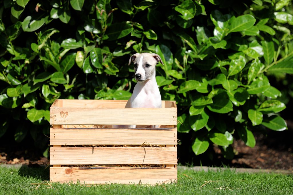 DIe Vorbereitung: endlich schönes Wetter, eine Kiste, viel Stroh, fünf süße Welpen, vier Arme und ein Kamerakind…