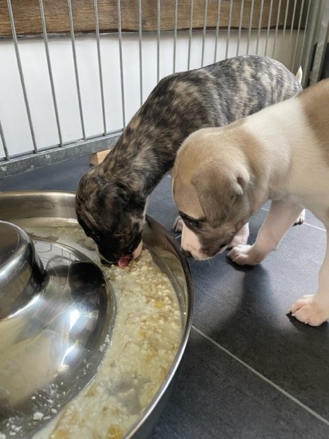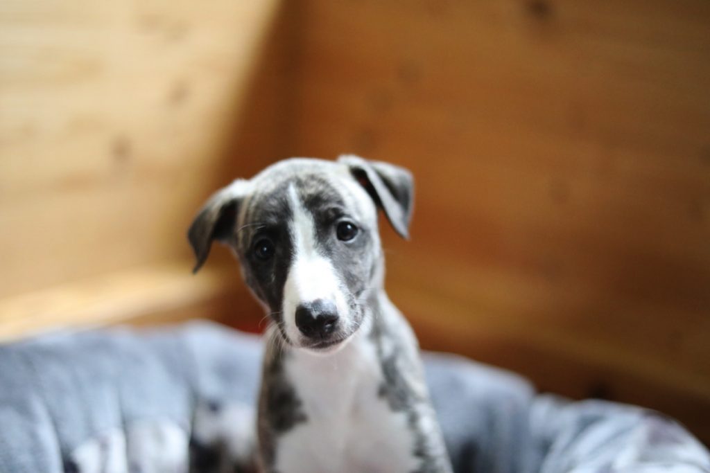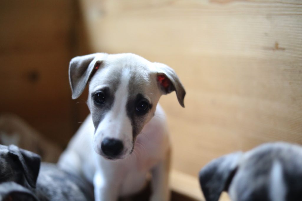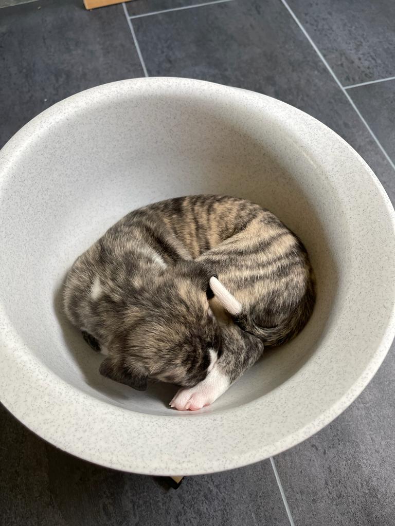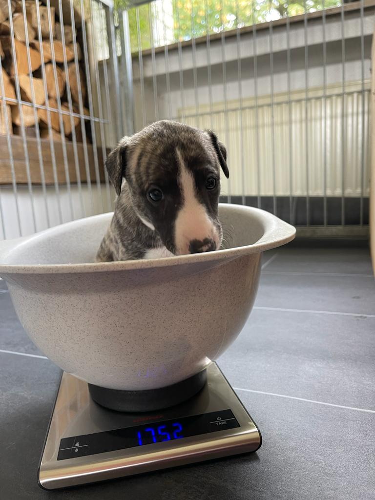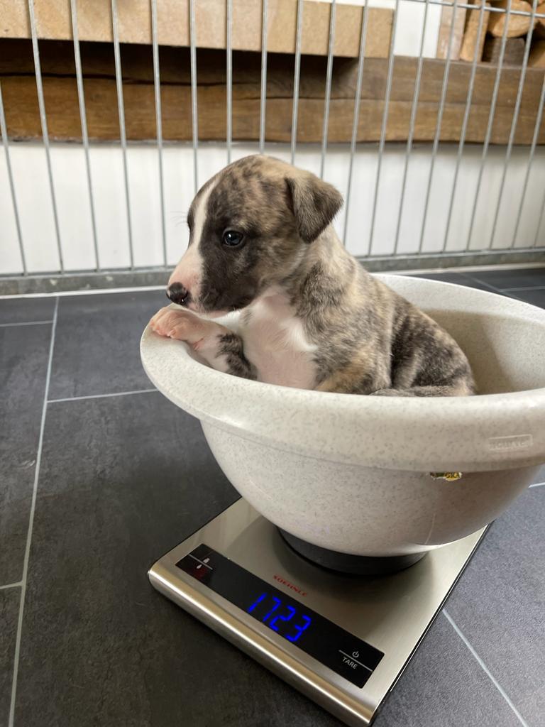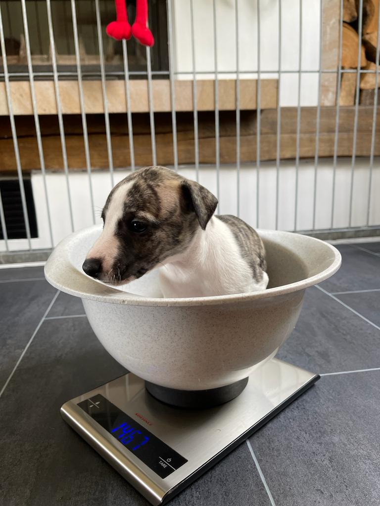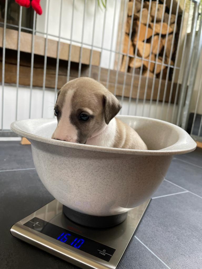 Die Gewichte der Welpen kontrolliere ich eigentlich so gut wie nie bzw. meist nur vor der Wurmkur-Rutsche. Aber es ist auch mal ganz interessant, die Daten mit Welpen aus anderen Würfen abzugleichen. So gab es also gestern „Whippet in Salatschüssel“- allerdings ohne Dressing 😉