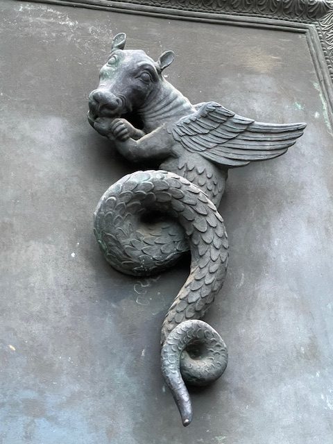 Als wir neulich mit dem WoMo unterwegs waren, kamen uns schöne Ziele unter bzw. nach einigen Kilometern wandern vor die Füße. Zum Beispiel das weltweit größte Mausuleum in Privatbesitz der Fürstenfamilie Schaumburg-Lippe. Auf eine Führung haben wir verzichtet. Aber ich fand‘ das Portal schon beeindruckend. Ich habe einen kleinen Drachen mit Nilpferd-Ohren entdeckt. Wie süß!