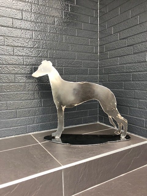 Wir haben seit zwei Wochen einen neuen Whippet. Lebensgroß, jedoch etwas kühl 😉 , aber pflegeleicht und wunderschön. Dieser Whippet ist handgemacht, aus einer Stahlplatte geschnitten und ziert nun unseren Hauseingang.